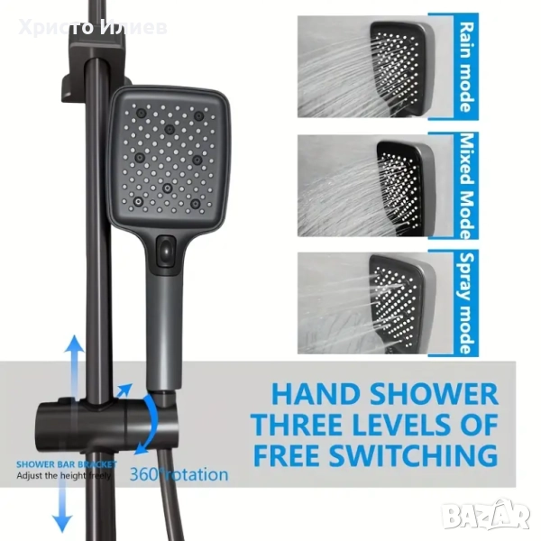 - Ръчен душ с възможност за регулиране на височината и ъгъла и три режима на работа и бутон за превключване между тях