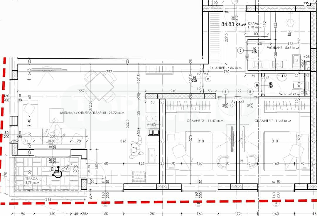 Имотът е разположен на трети етаж от пет със следното разпределение: Г-образен коридор с килер, светла и просторна всекидневна 29.7 кв.м. с излаз на тераса, две спални по 11.5 кв.м., два санитарни възела.