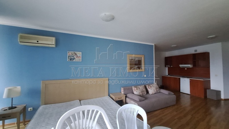 МЕГА ИМОТИ предлага двустаен апартамент, на метри от северния плаж. Апартаментът е разположен на четвърти етаж и се състои от дневна с кухненски кът, спалня, санитарен възел с баня и тераса. Изложение -юг. Жилището се предлага с наличното обзавеждане. Комплексът разполга с басейни, бар, детска площадка, градина, целогодишна охрана и поддръжка 9,6Е/кв.м. С възможност за менажиране на имота. Реф.номер 16598