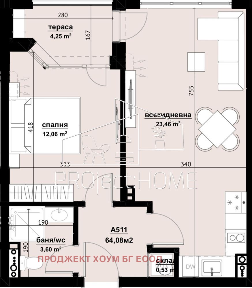 🛋 Разпределение: входно антре, склад, просторна всекидневна с кухня, спалня, баня с тоалетна, тераса с достъп от двете стаи