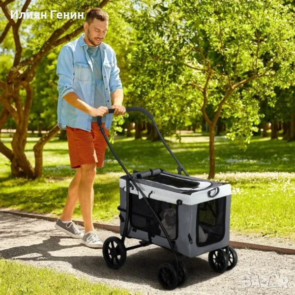 Сгъваема количка за домашни любимци: Тази количка за кучета разполага с удобен за потребителя механизъм за сгъване, който я прави изключително преносима и лесна за съхранение в багажника на кола. Тя е истинска революция за пътуване, пазаруване, посещение на ветеринар или ежедневни разходки с кученцата.
