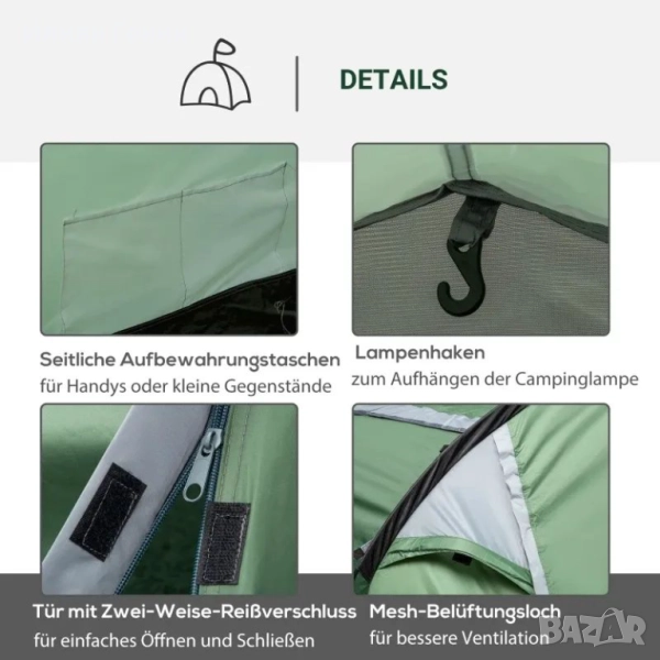 Висококачествен материал: водоустойчив полиестерен дъждобран 190T и здрави, гъвкави фибростъклени пръти гарантират стабилност. Заземените пирони и въжета поддържат палатката стабилна при вятър.