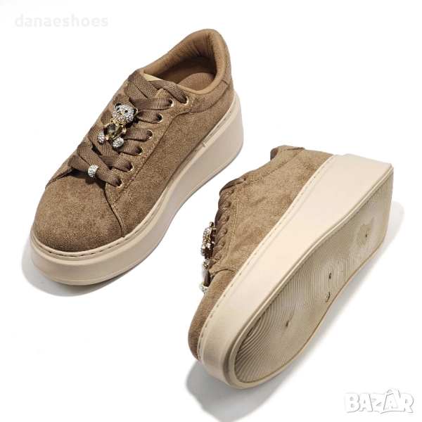 Дамски спортни обувки на платформа. Изработени от еко велур с метален аксесоар мече на връзките. Много леки и удобни. Хит за този сезон. Номерация 36-41. Налични и в черно.