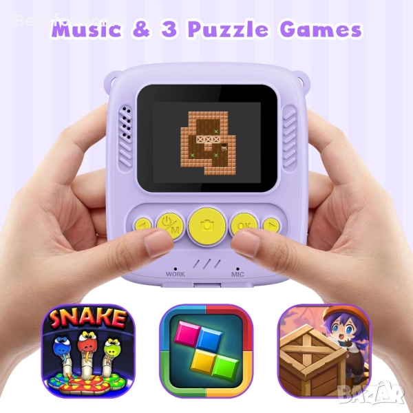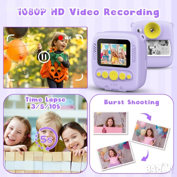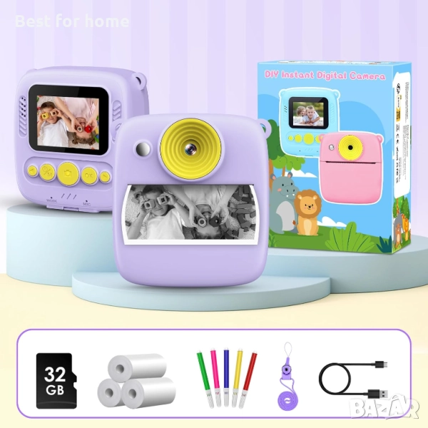 Детски фотоапарат Gofunly Instant Print, 1080P 32GB карта и 3 ролки фотохартия, 2.0" детски фотоапарат, забавни детски играчки, подаръци за рожден ден за момчета и момичета на възраст 3-10 години (лилав)
