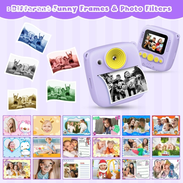 【Многофункционален детски цифров фотоапарат】Детски фотоапарат с моментално печатане, оборудван с 2.0-инчов екран, поддържа 1080P видеозапис, 8x цифрово увеличение, снимки с таймер, непрекъснато снимане, забавни рамки за снимки, различни филтри, запечатвайки всеки смислен момент от детството!