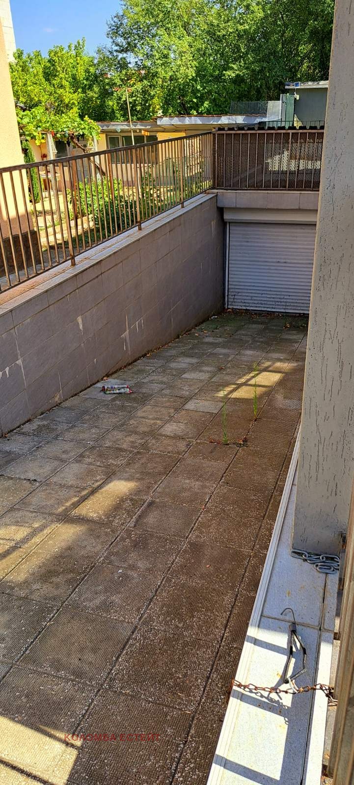 От хола има излаз към просторна градина с градинска маса, столове, барбекю, външна чешма, езерца за рибки, тревна площ и басейн с мокър бар. В двора се намира гараж/работилница с климатик, ролетна щора с дистанционно управление и СОТ система, а също и две допълнителни паркоместа с навес. Подземният гараж има топла връзка към приземния етаж и е обзаведен с мека мебел, парно, маса с барплот и билярдна маса подходящо пространство за фитнес.