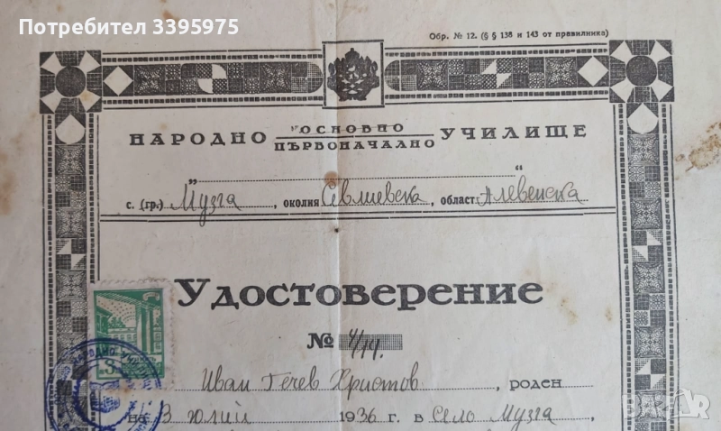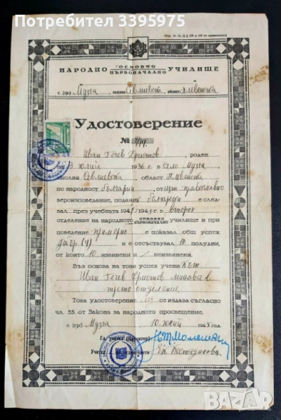 Оригинално удостоверение (сертификат) от 1945 г. за преместване на ученик от втори в трети клас. Документ с държавен печат, подписи, печат и клеймо на Народното училище, с. Музга, район Севлиево, област Ловеч.