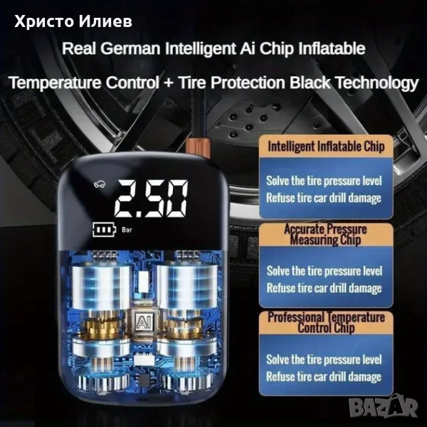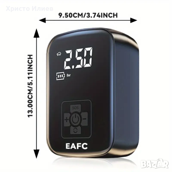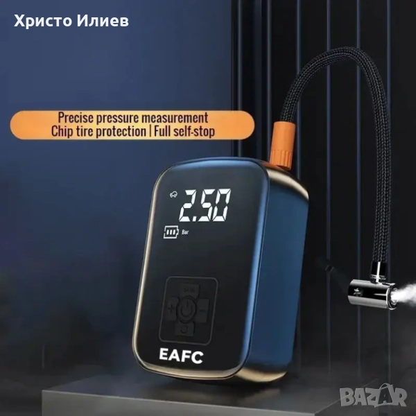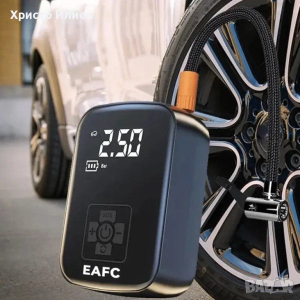 Компактният и лек дизайн на компресора го прави лесен за носене и съхранение в багажника на вашия автомобил. Безжичната му функция гарантира удобство и мобилност, позволявайки употребата му навсякъде, без нужда от електрически контакт или дълги кабели.