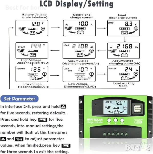【ФУНКЦИОНАЛЕН LCD ЕКРАН, ЛЕСЕН ЗА ЧЕТЕНЕ】Интуитивен LCD дисплей, който показва състоянието и данните, както и режимите на превключване и конфигурацията на параметрите. Нивото на пълно изключване е регулируемо, което перфектно предпазва литиево-йонната батерия от презареждане, подходящ за дома, промишлеността, търговията и др.
