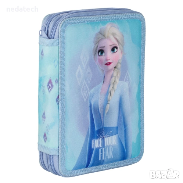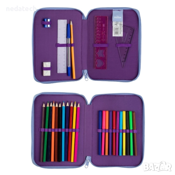 Несесер в светло син цвят с дизайн на Замръзналото кралство 2. Съдържа молив, син химикал, пластмасова острилка, гумичка, права линийка 15 см, права линийка с форми 15 см, триъгълник 10 см, 11 молива и 11 маркера.