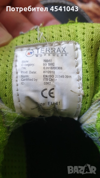 Продавам работни обувки Terrax Workwear, размер EU 41, категория S3 SRC – със стоманена капачка, антипроникваща подметка и защита против хлъзгане. Отговарят на стандарт EN ISO 20345:2011.