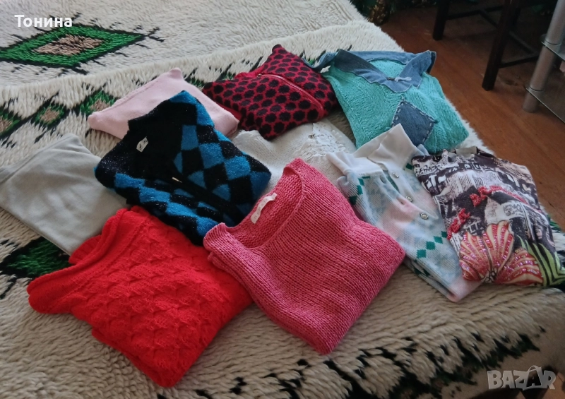 Дамски блузи и пуловери, от които и ръчно плетиво. Цената е за всички заедно. 20 Евро за всички заедно.
