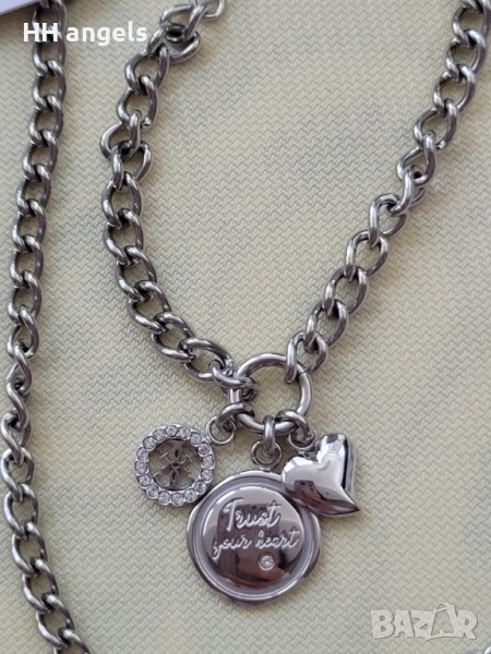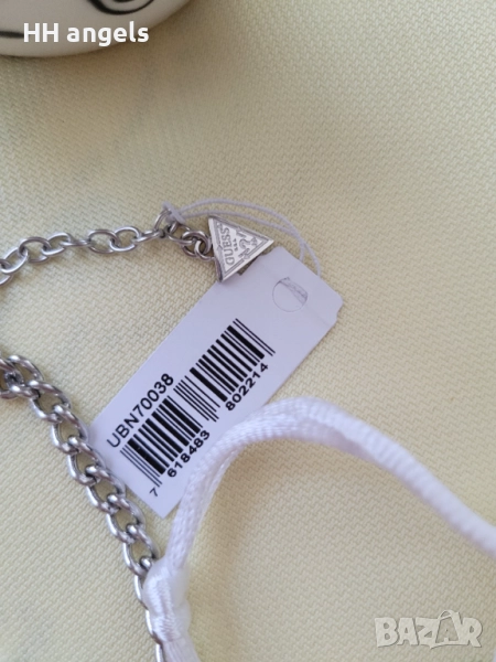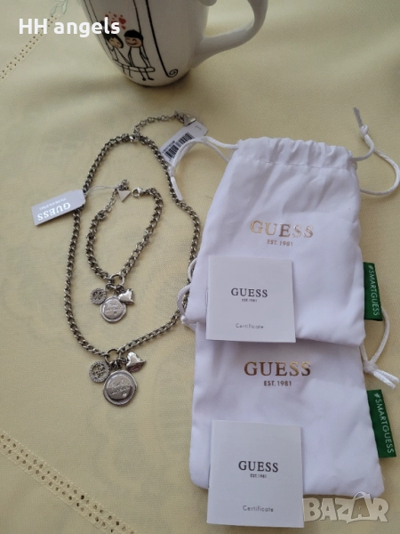 Guess НОВ комплект,състоящ се от колие и гривна- 145лв. с реална цена над 200 лв.модел:GUESS MY FEELINGS ,със сертификати и етикети,в противопрахови торбички.Закопчаване с карабинер,регулируеми модели,лого висулки с нежни кристали Сваровски,от неръждаема стомана в сребрист цвят.Колие модел: Колие GUESS MY FEELINGS
