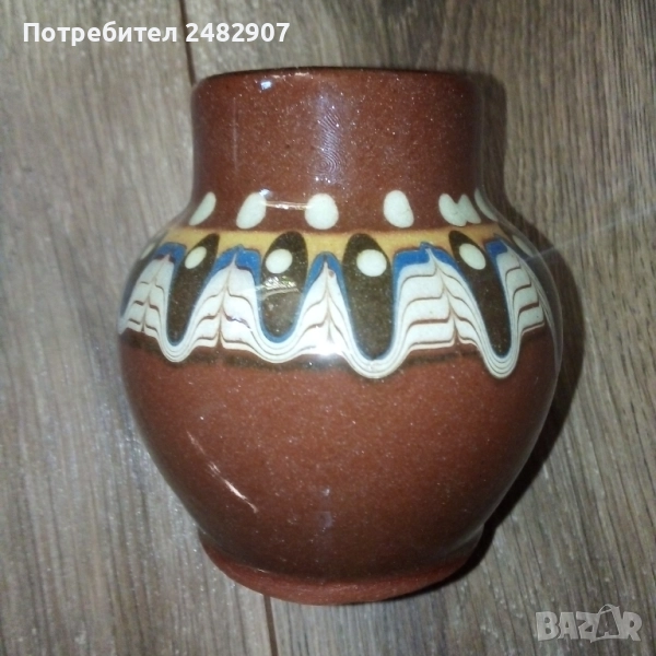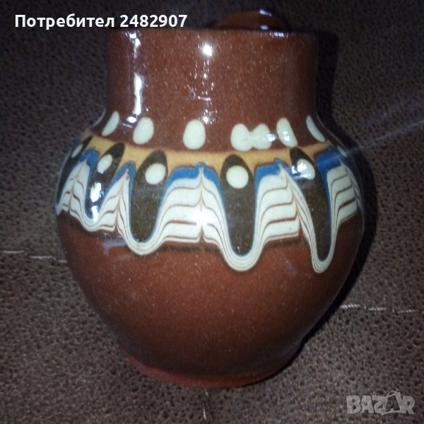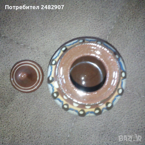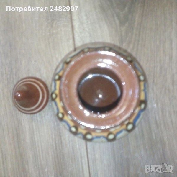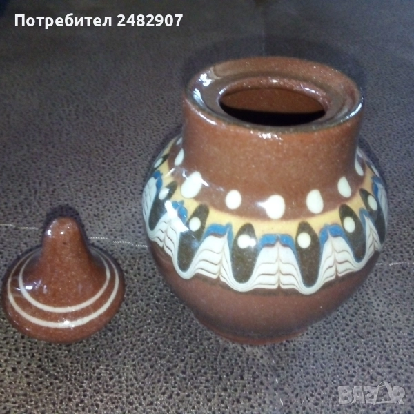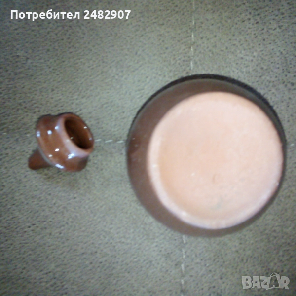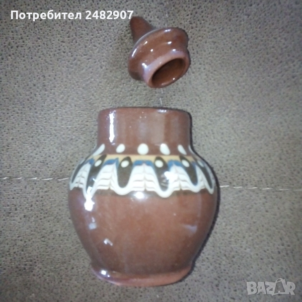 Стара глинена захарница с капаче от времето на соца. Диаметър в долната част - 5 см, диаметър в горната част - 4,5 см, височина - 8,5 см, височина на капачето - 3,5 см. Чисто нова, не е използвана, подходяща за колекция, декорация, подарък или употреба.