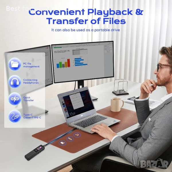 64GB огромна памет и дълго време за запис: Снабден с 64GB памет, това устройство за запис на глас може да съхранява до 4800 часа записи. С вградена акумулаторна батерия, диктофонът поддържа до 30 часа непрекъснат запис с пълно зареждане. Освен това, записващото устройство автоматично запазва файловете, когато батерията е изтощена, без да се притеснявате за повреда на записите си.