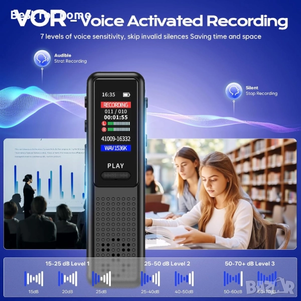 VOR - Диктофон с гласово активиране: С функция за гласово активиране, регулирайте 7 нива на чувствителност на гласовото управление, този аудио рекордер започва да записва автоматично, когато засече звук, спестявайки време и енергия