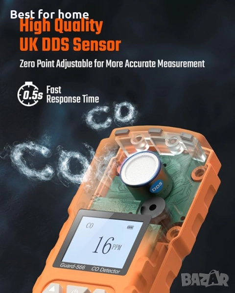 Висококачествен CO сензор и многорежимни аларми: CO мониторът Guard-566 е оборудван с високопрецизен DDS сензор, осигуряващ точни измервания с време за реакция от 0,5 секунди. Той е оборудван със звукови, визуални и вибрационни аларми за съобщаване на критични сигнали в различни среди.