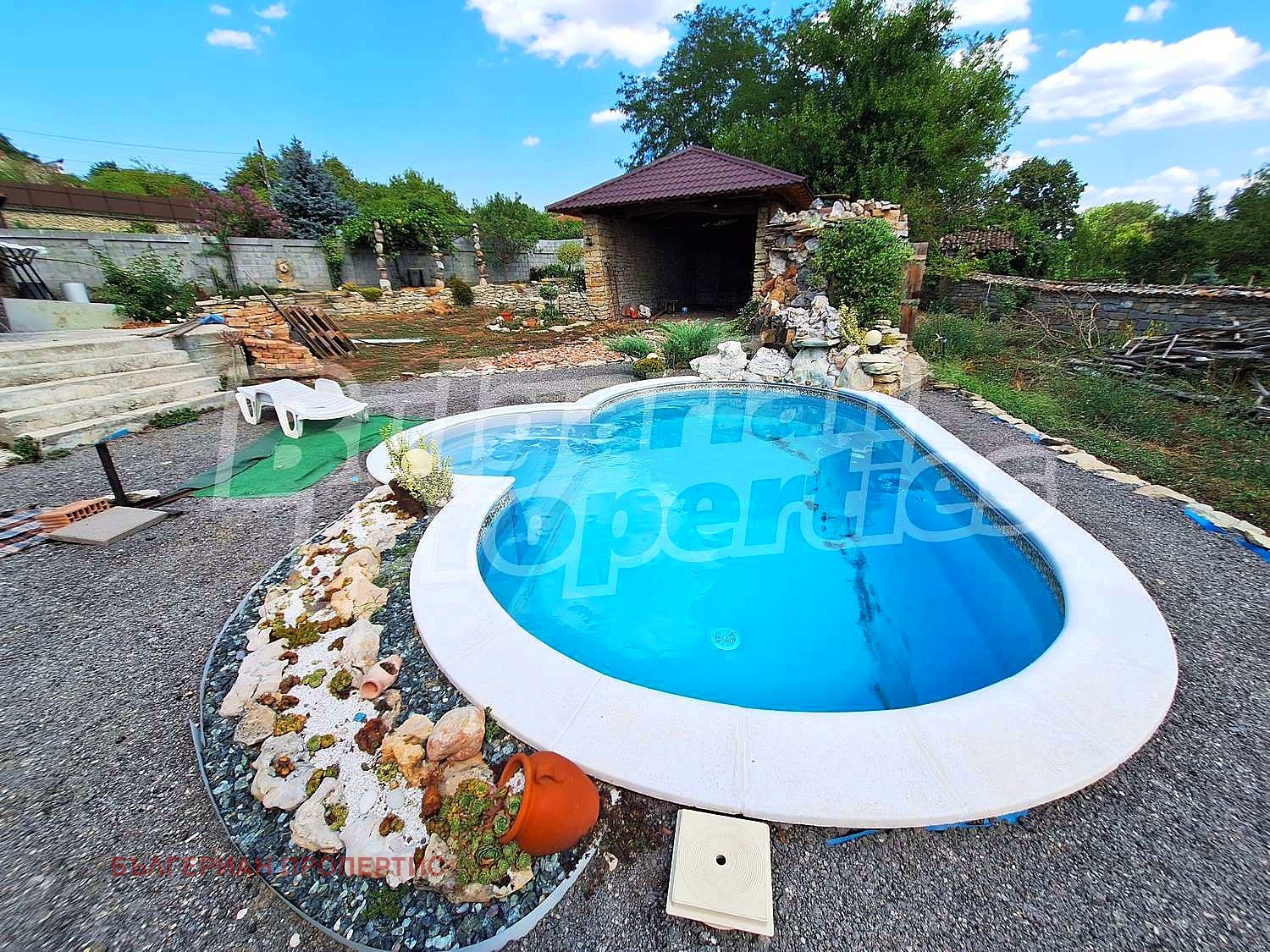 Дворът с площ 1000 кв.м. разполага и с красива каменна постройка с нов покрив и потенциал да се превърне в жилищна, стара къща, както и новоизграден басейн с декоративен водопад и красиво оформено езерце с