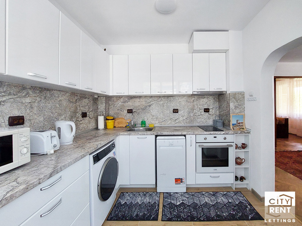 Подовата настилка е с паркет и теракот, стените са с латекс, вратите са дървени, а дограмата PVC. На разположение на наемателите са налични климатик, готварска печка, пералня, съдомиялна, хладилник, микровълнова фурна, тостер, ел. кана и два телевизора.