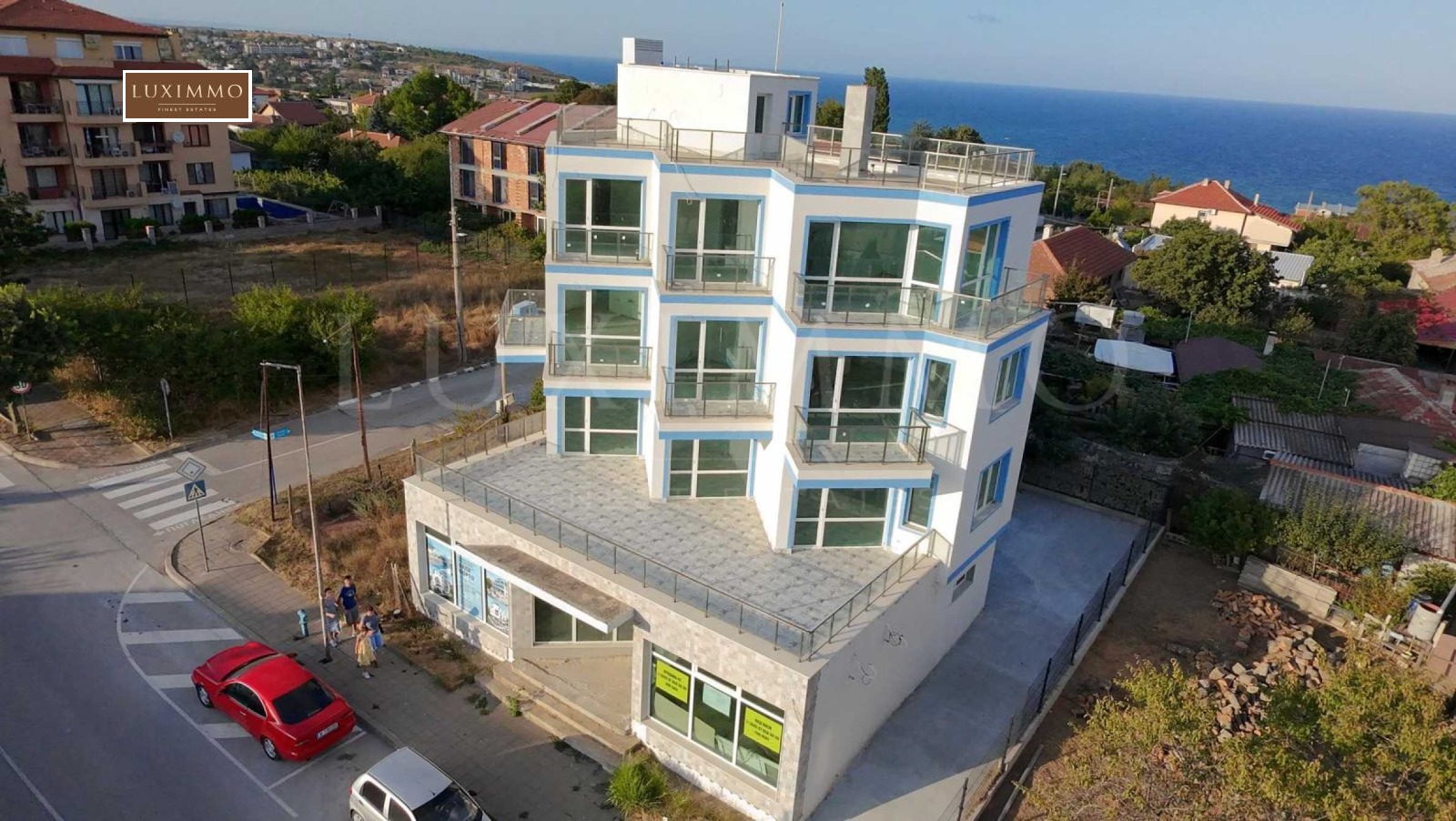На етаж има по два апартамента и всеки апартамент разполага с килер, тераса и гледка към морето.