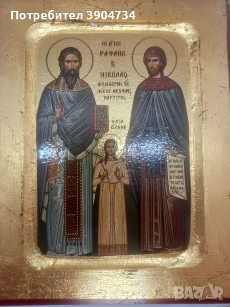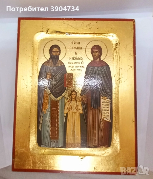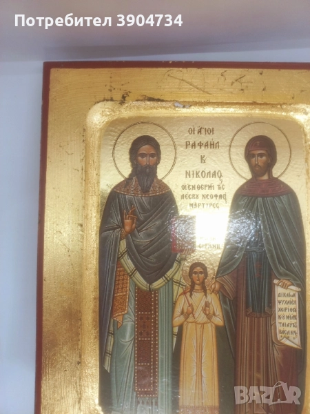 Стара Гръцка икона със сертификат изработена върху дърво изобразяваща Свети Рафаил, Николай и Ирина, чудотворните мъченици от Лесбос. Светците са особено обичани в православната църква за мъченическата си жертва и многото чудеса, които са извършили, носейки духовна утеха и помощ на вярващите.Добро състояние за годините си.