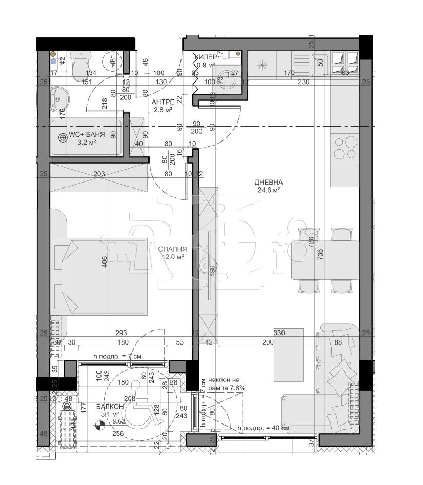 Състои се от антре, голяма всекидневна, спалня, баня с тоалетна, килер/перално, балкон.