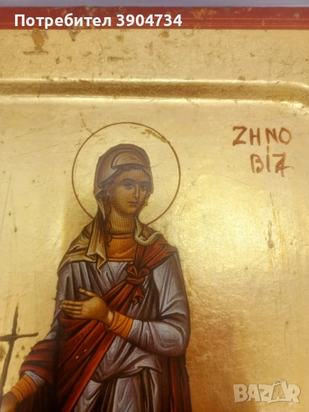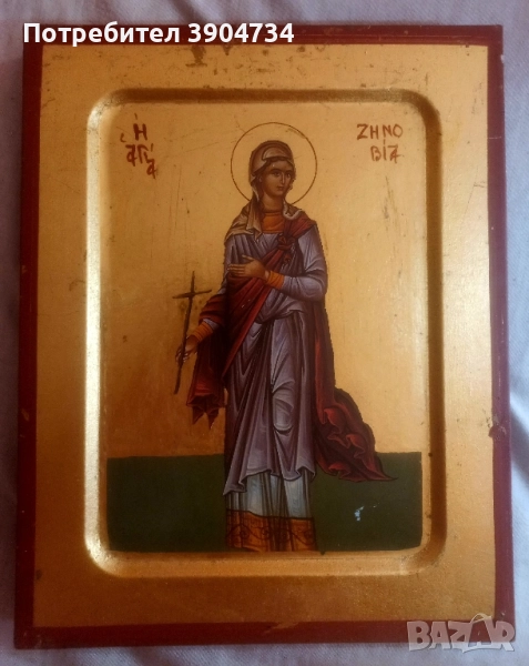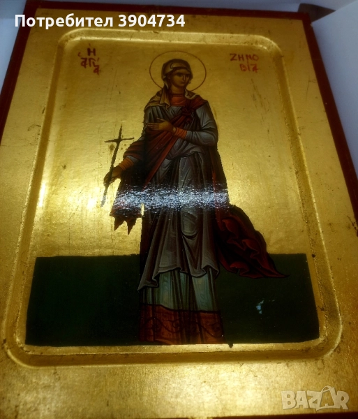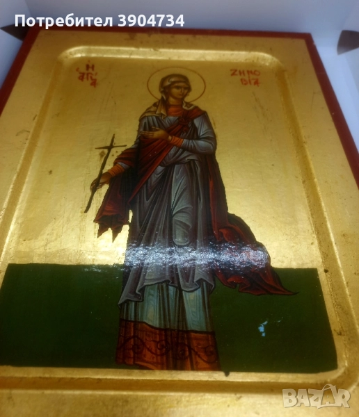 Стара Гръцка икона изработена върху дърво на Св.мъченица Зиновия.На 30 октомври се чества Св.Мъченици Зиновий и Зиновия.Празнуват Зорница, Зорка и др.Зорница е богиня на утрото в славянската митология. Зинови е име от гръцки произход и означава живеещ благородно.Добре запазена за годините си!