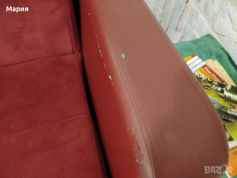 , бордо. Облегалките не се закрепят за дивана, а стоят до него. Кожата по тях е за смяна.
