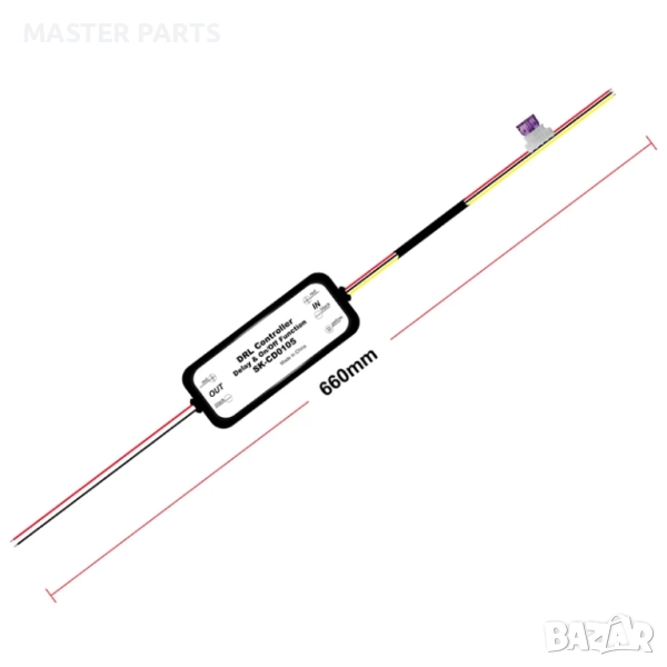 • Изход: Червен (+) и черен (-) кабел – към съответните полюси на дневните светлини.