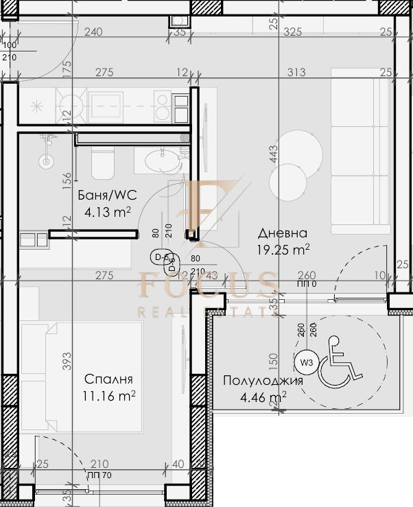 Разпределение: антре, дневна с кухненски бокс, спалня, баня с тоалетна и тераса.