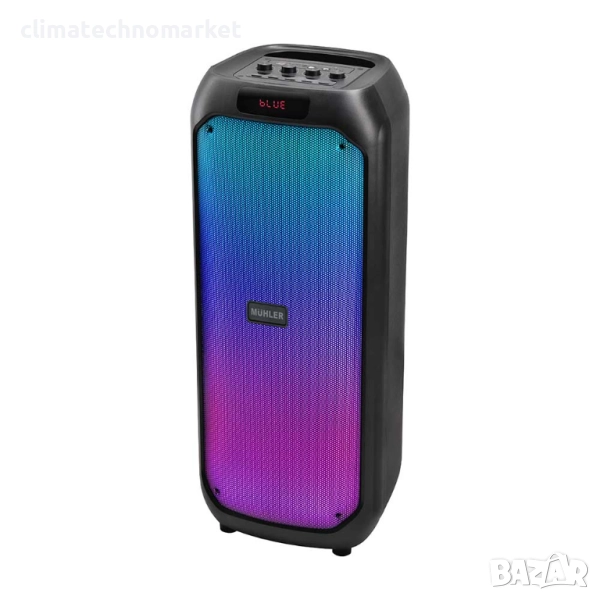 Активна тонколона Muhler MAX881R; Говорител: 2x8''; Функции: USB слот, FM радио, Bluetooth; Цветно осветление; Батерия: 7.4V/3600mA; Честотна характеристика: 45Hz-20kHz; Съпротивление: 3oHm; Мощност: 40W; Аксесоари: 2бр. безжични микрофони; Цвят: Черен; Нето тегло: 6.50kg; Бруто тегло: 7.15kg; Размери (ВхШхД): 700x285x270mm; Размери опаковка (ВхШхД): 735x305x290mm; Гаранция за физически лица: 2 години;