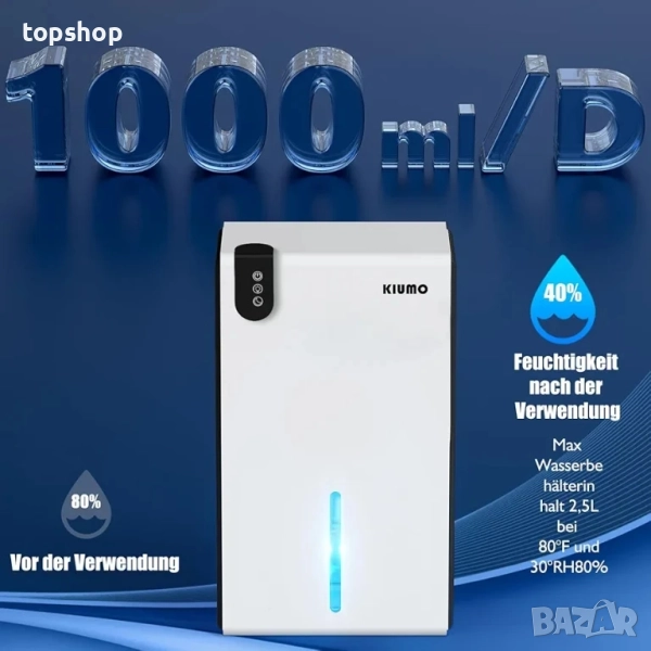 Нов тестван влагоуловител Kiumo CT9, (30 м²) 2,5 л, С автоматично спиране, 7 цвята ред светлина → Обява 51588981