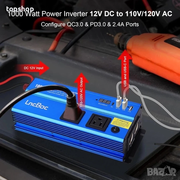1000w автомобилен инвертор: Адаптер за автомобилен контакт. Осигурява два 110V AC контакта с непрекъснат DC към AC изход, QC3.0 и PD и 2.4A 3 USB порта, два 12V автомобилни запалки и 2 резервни 40A предпазителя. Интелигентният дисплей може автоматично да открива и показва температурата на автомобила, заряда на батерията, USB напрежението и тока.