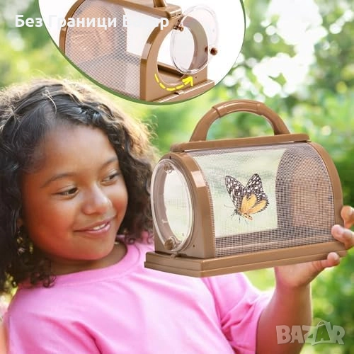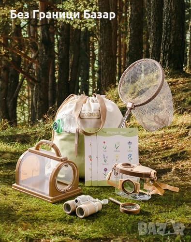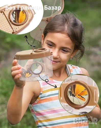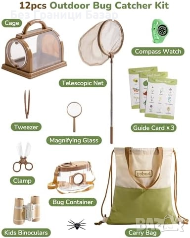 Включва кутия за насекоми, клетка, бинокъл, мрежа, пинсети и лупа
