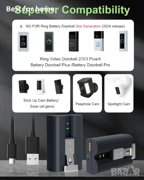 ШИРОКА СЪВМЕСТИМОСТ: Перфектната резервна батерия тип пръстен, съвместима с Ring Video Doorbell 2, Video Doorbell 3, Video Doorbell 3 Plus, Video Doorbell 4, Battery Doorbell Plus, Battery Doorbell Pro, Stick Up Cam Battery/Solar (всички поколения), Stick Up Cam Pro Battery/Solar, Spotlight Cam Battery/Solar, Spotlight Cam Plus Battery/Solar/Wired, Spotlight Cam Pro Battery/Solar/Wired, Peephole Cam, Solar Floodlight