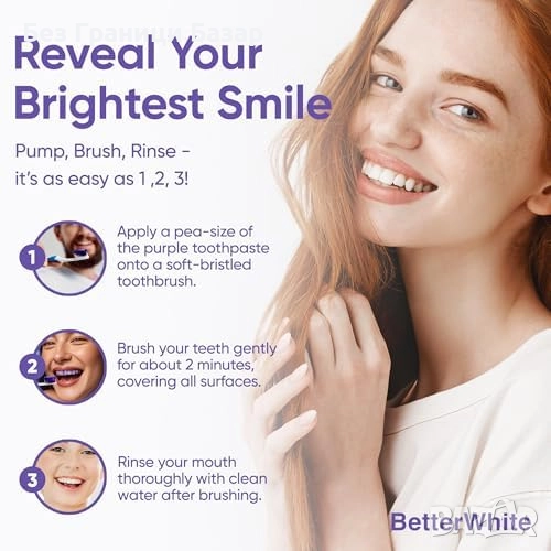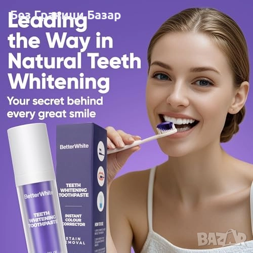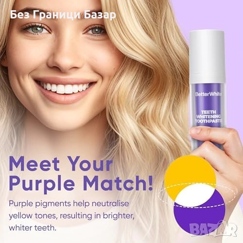 Лилава паста за зъби, неутрализираща жълти тонове за мигновено по-светла усмивка