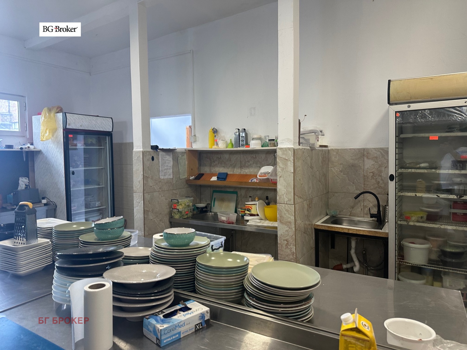 - Работни помещения с площ около 120кв.м., състоящи се от кухня, миялно помещения, хладилен склад, сух склад, офис, стая за персонал с тоалетна, сервитьорско помещение и бар със склад