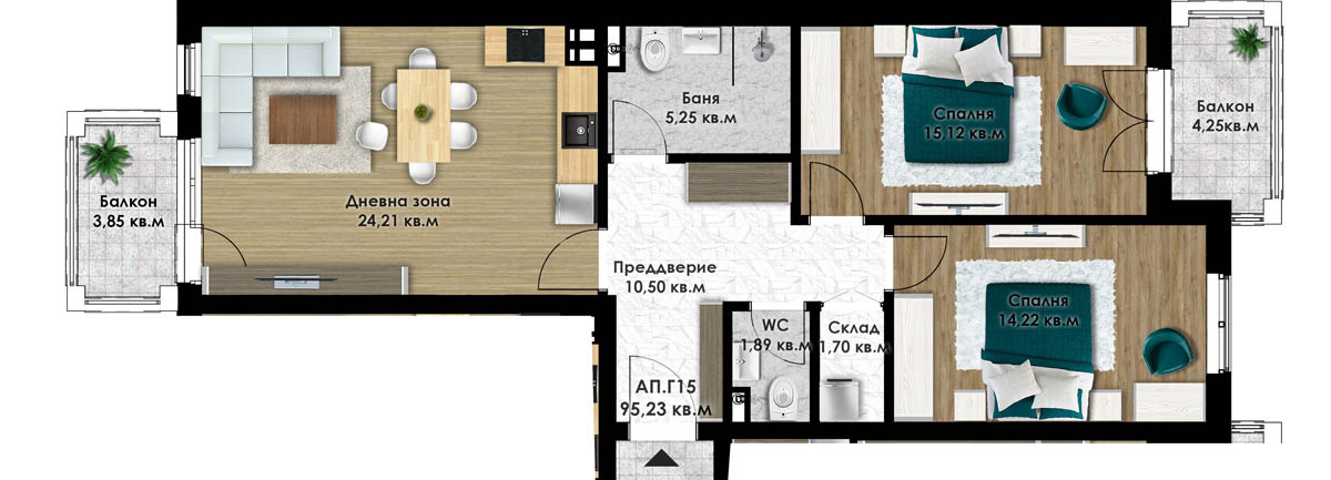✅ Жилището се състои от входно антре, хол с кухня, две спални, 2 балкона, 2 бани с тоалетни, склад.