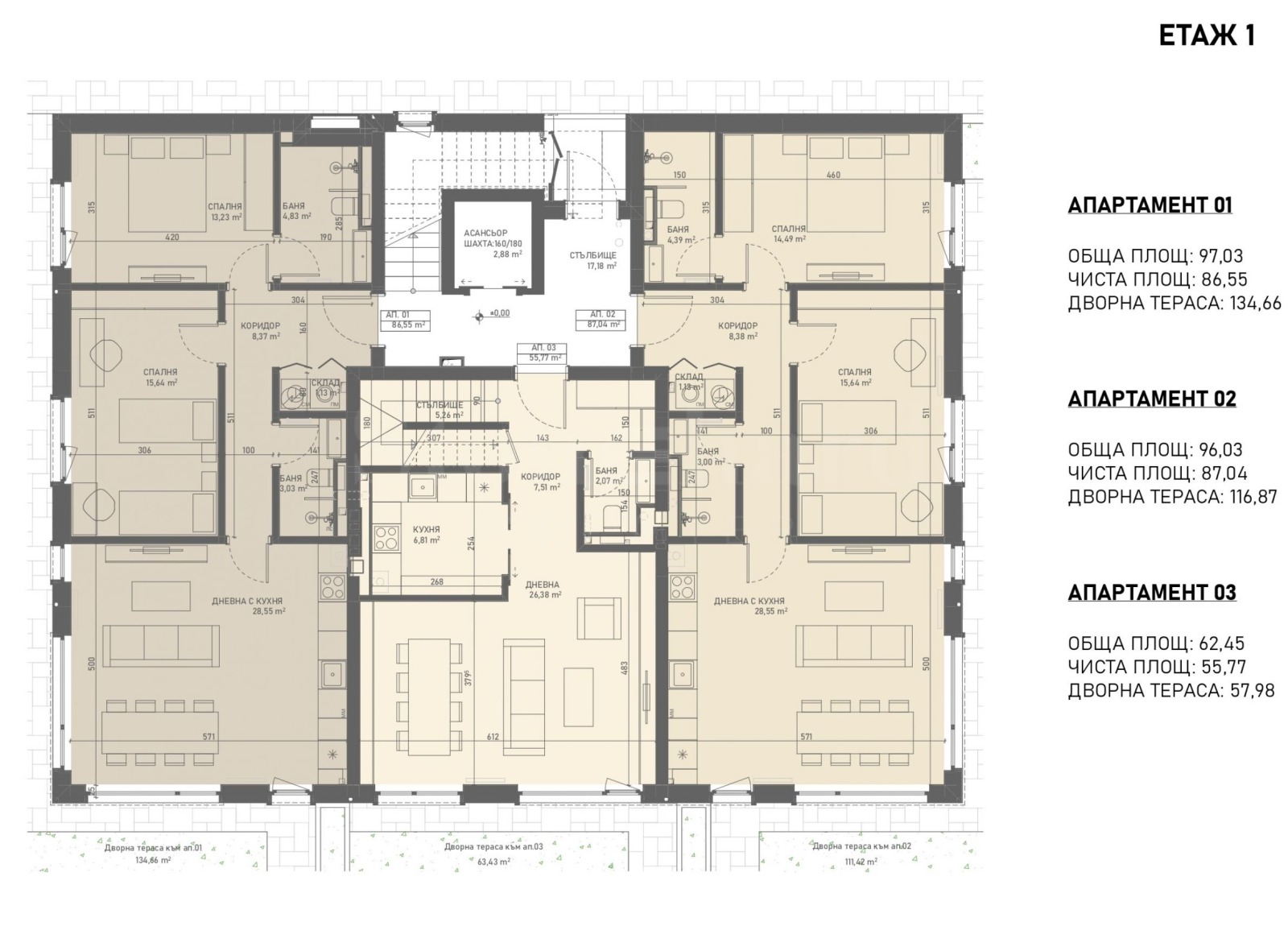 Апартамент 2 е разположен на 1-ви етаж и има обща площ 96,87 кв.м. Разпределението включва две спални, две бани с тоалетни, склад, просторна дневна с кухня и трапезария. Към имота принадлежи голям частен двор от 116,87 кв.м - отлична зона за релакс на открито.