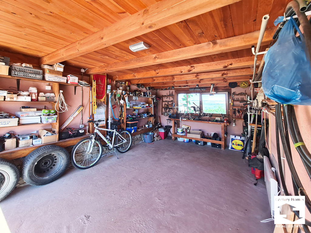 Имотът представлява масивна двуетажна къща с разгъната застроена площ от 180 кв.м., изградена и поддържана с внимание към детайла. Първият етаж включва просторно входно антре, уютна и светла дневна с камина, обособена кухненска част с трапезария, баня с тоалетна и котелно помещение. Красиви дървени стълби водят до втория етаж, където се намират три комфортни спални, второ санитарно помещение, килер и три панорамни тераси, от които се откриват прекрасни гледки към природата.