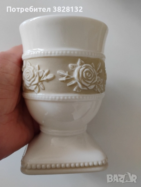 Чаша от Лене Бьере /"Lene Bjerre Hand Design"/, колекция Portia, декоративна, готова да заживее отново и да радва своя притежател. Замислена като чаша за четки за зъби, тя спокойно може да се ползва и като моливник, и като вазичка за сухи цветя, или каквото се сетите. Кремаво-бяла на цвят с декоративна лента в пясъчен цвят, украсена с релефни рози. Изработена от керамика, което я прави издръжлива и лесна за поддръжка. Без забележки. 🤝 25 лева/12.78 евро.