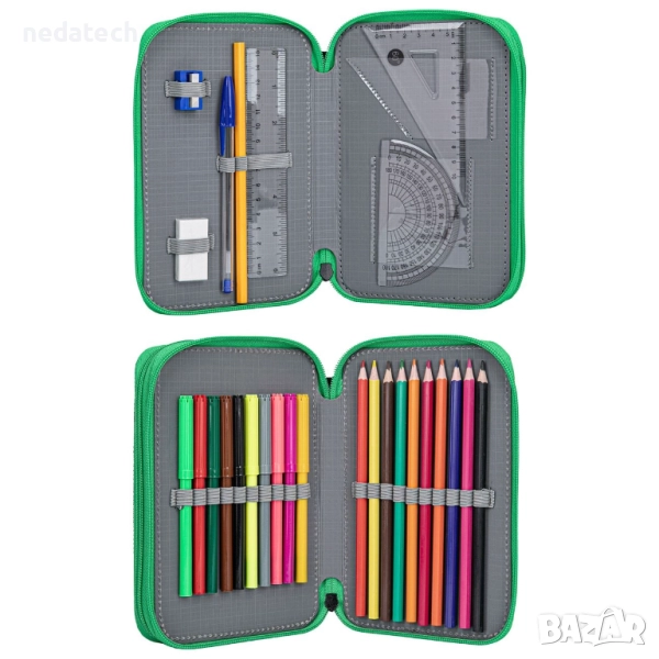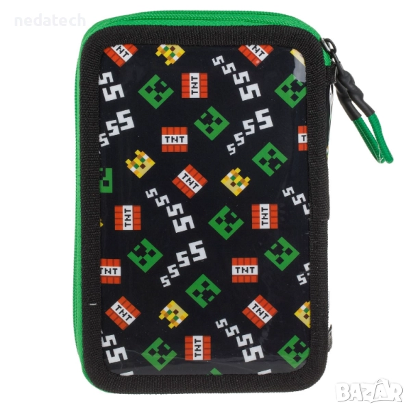 Двоен черно-зелен несесер с 3D Minecraft дизайн. Съдържа молив и син химикал, пластмасова синя острилка, гумичка, права линийка 15 см, триъгълник и транспортир 10 см, 10 цветни молива и 10 маркера.