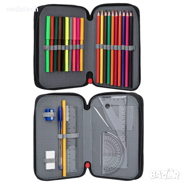 Несесер с 3D дизайн на Brawl Stars. Съдържа молив и синя химикалка, пластмасова синя острилка, гумичка, права линийка 15 см, триъгълник и транспортир 10 см, 10 цветни молива и 10 маркера.