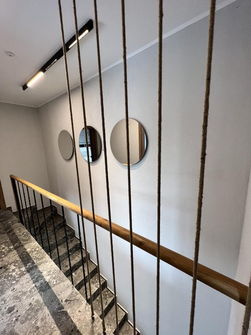Към второто ниво води атрактивно стълбище, където са разположени коридор, три спални с три бани и две тераси.