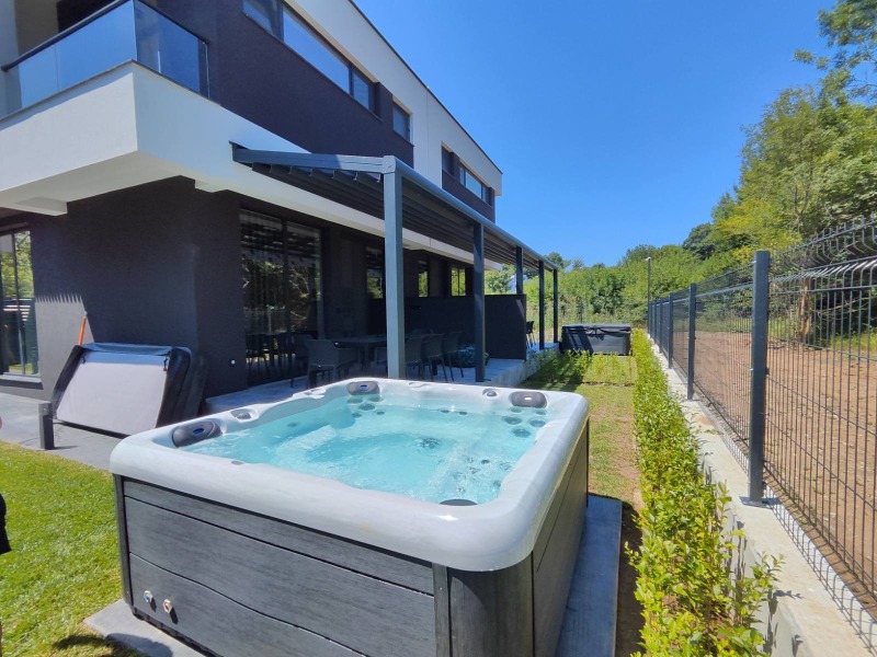 Къщата е функционално разпределена на две нива. На първото ниво е разположена просторна дневна с модерен кухненски бокс с вградени електроуреди от най-висок клас, тоалетна и склад. Имотът има прекрасна веранда с пергола и джакузи в двора.