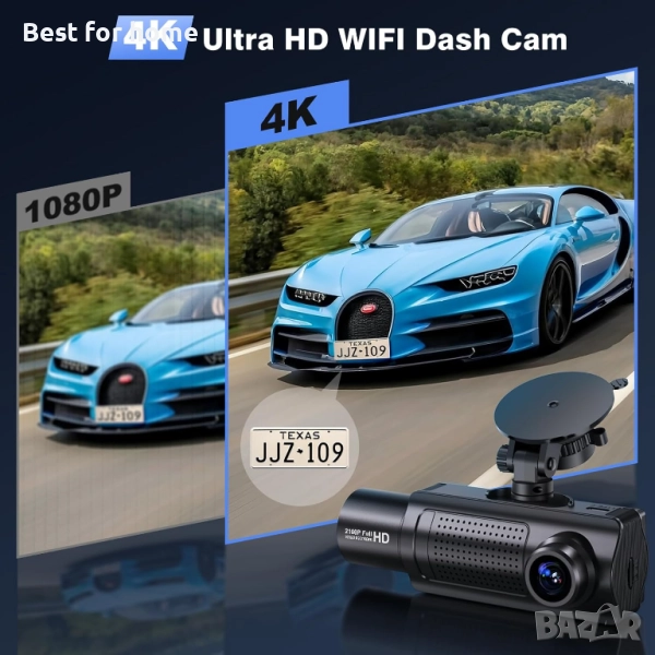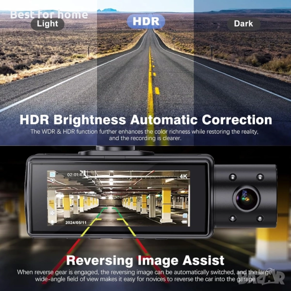 Специална функция 4K двойна предна и задна видеорегистратор, 5GHz по-бърз Wi-Fi, безплатна персонализирана 64GB високоскоростна SD карта, асистент за задно виждане, функция за двоен режим на паркиране, супер инфрачервено нощно виждане, супер бленда F1.5, сензор Sony IMX662, 360° супер широкоъгълен обхват, цикличен запис, 3-осен G-сензор, WDR и HDR