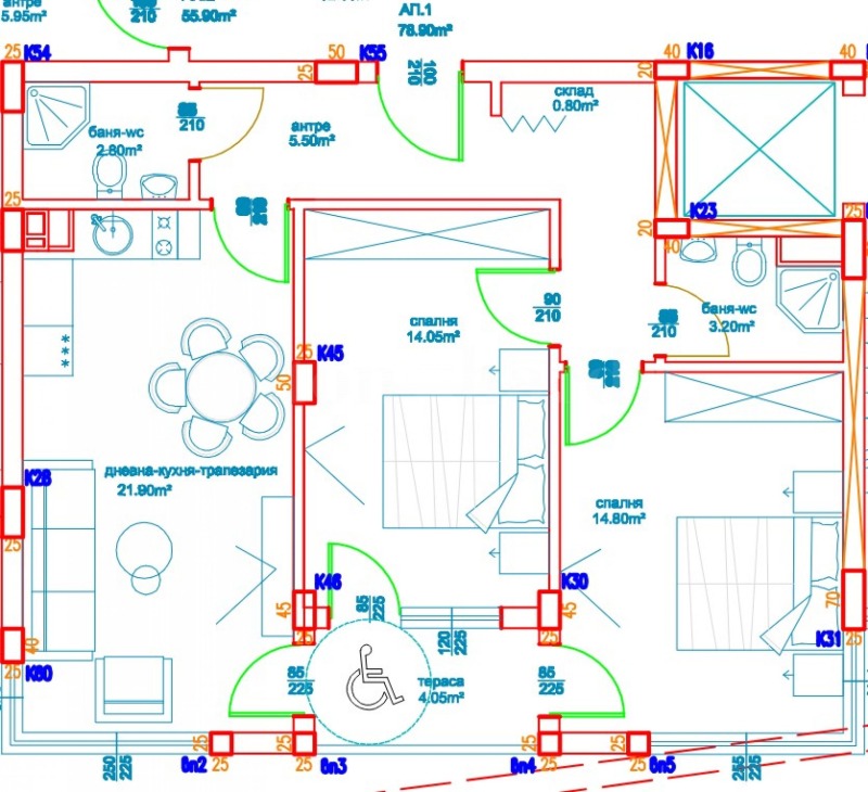 Имотът е с обща площ от 98.50кв.м, разположен на 5-ти етаж и се състои от: антре, дневна с кухня, две спални, две бани с тоалет, склад и тераса. Издава се в степен на завършеност по БДС, на шпакловка и замазка.