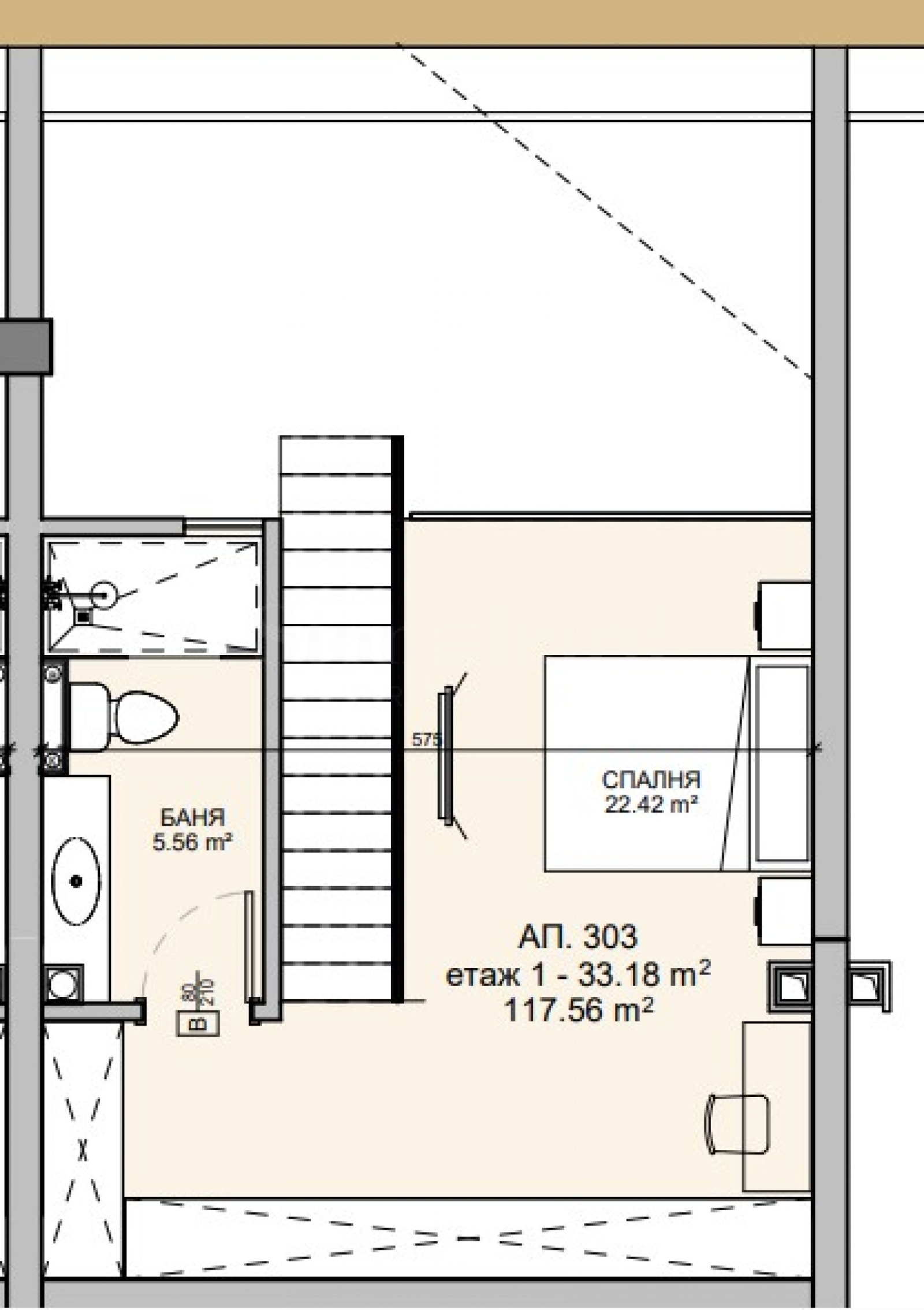 Имотът е ситуиран на 3-ти и 4-ти етаж и предлага 147.19 кв.м обща площ (нетна площ 119.53 кв.м + общи части 27.66 кв.м). Първият етаж се състои от антре, всекидневна с кухненски бокс, спалня, баня с тоалетна, тераса, а ниво две разполага със спалня и баня с тоалетна.