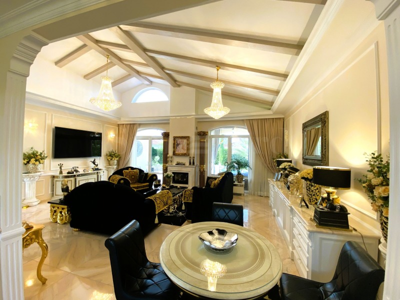 Вилата е елегантно обзаведена с индивидуално изработени мебели. В интериора са използвани луксозни естествени материали, мрамор 'Rosso portogalo' и дърво.