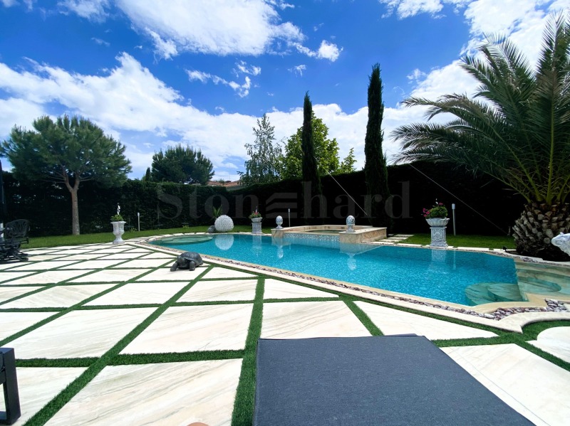 В богато озеленената градина с екзотични дървета и цветя, централно е разположен басейн с джакузи, изцяло облицовани с естествен камък Rosso portogalo . Разполага и с паркомясто с навес до самия вход.